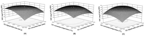 Each plot of the interactive effects between two individual parameters on TPC is drawn while keeping the other variable at a fixed intermediate level. The interactive effect between the extraction time and liquid/solid ratio showed a remarkably negative effect on TPC (p < 0.0001) (Figure 1A, Table 1). The interactive effect between the extraction time and extraction temperature showed a significant positive effect on TPC (p < 0.01) (Figure 1B, Table 1). The interactive effect between the extraction temperature and liquid/solid ratio showed no significance on TPC (p > 0.05) (Figure 1C, Table 1). The TPC increased with the increase in extraction time and then showed a gentle or slightly decreasing trend, which was consistent with the results of single-factor experiments. A longer primary extraction time would expose the LSP to the extraction system, rupture the cell wall, and might release more intracellular components, while further extension of the extraction time might lead to the degradation of TPC [21,22]. The liquid/solid ratio played a positive role in TPC. The TPC increased with the initial increase in the liquid/solid ratio, while exceeding the specific range, and a decrease in TPC was displayed, especially with a prolonged extraction time. The present effect could be explained as follows: within the certain range, more water led to a higher relative contact area, and the interaction between water and phenolic compounds may be enhancive and thus increase the dissolution capacity of intracellular components [23]; exceeding the certain range, more water might increase the amount of oxygen dissolved in the extraction system, which could increase the oxidation of phenolic compounds at high temperatures with a long extraction time [24].