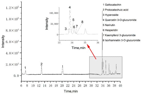 A total of eight phenolic compounds were identified from the LSP extract: gallocatechin, protocatechuic acid, hyperoside, quercetin 3-O-glucuronide, narirutin, hesperidin, kaempferol 3-glucuronide, and isorhamnetin 3-O-glucuronide. These identifications (Table 2) were based on spectral data from literature data and MS database references [34,35,36]. Among these eight phenolic compounds, seven are flavonoids and one is phenolic acid, which could explain the FRAP assay results compared to our previous work. Figure 3 shows that the primary component was quercetin 3-O-glucuronide, which agrees with our previous work, indicating that MCAE is effective for extracting phenolic compounds from LSP.