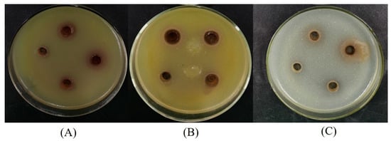 Diameters of inhibition zones of the LSP extract against the bacteria. (A) E. coli, (B) S. aureus, and (C) B. subtilis.