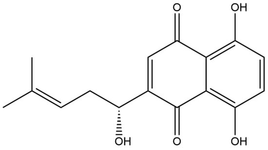 Lithospermum erythrorhizon, a traditional Chinese medicine, is known for its sweet, salty, and cooling taste. It primarily regulates the heart and liver meridians, offering various benefits such as bringing down heat, cooling the blood, detoxifying, and minimizing rashes. As an active ingredient in Lithospermum erythrorhizon, the molecular formula of Shikonin is C16H16O5 (Figure 1), which is a kind of natural naphthoquinone extracted from the root of Lithospermum erythrorhizon. Lithospermum erythrorhizon, also known as lithospermum paste, was first recorded in the classic Chinese medical book Shennong’s Herbal Classic. Since ancient times, it has been widely used to reduce body surface heat, promote blood circulation, clear congestion, and detoxify. In addition, other diseases, such as macula, measles, sore throat and carbuncle, have also been treated using comfrey paste. In recent decades, it has not only been applied in different Chinese herbal formulations to treat various internal diseases but also made into topical drugs for the treatment of skin diseases [1]. Shikonin has many pharmacological properties, including anti-inflammatory, antioxidant, antibacterial, and anti-tumor properties, ameliorating of skin diseases and having other pharmacological effects [2,3,4,5,6,7,8].