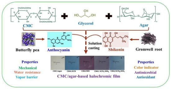 Schematic diagram of the fabrication of carboxymethyl cellulose (CMC)/agar-based functional color-changing membranes [26].