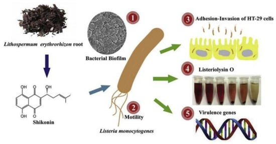 - Li, J.; Li, S.; Li, H.; Guo, X.; Du, G.; Yang, Y.; Wang, X.; Zhang, C.; Shan, Z.; Xia, X.; et al. Antibiofilm activity of shikonin against listeria monocytogenes and inhibition of key virulence factors. Food Control 2021, 120, 107558. [Google Scholar] [CrossRef]