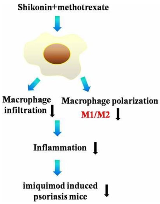 - Tao, T.; Chen, Y.; Lai, B.; Wang, J.; Wang, W.; Xiao, W.; Cha, X. Shikonin combined with methotrexate regulate macrophage polarization to treat psoriasis. Bioengineered 2022, 13, 11146–11155. [Google Scholar] [CrossRef] [PubMed]
