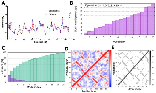 Molecular dynamic simulation of a predicted TXNIP with α-phellandrene: (A) deformability; (B) eigenvalues; (C) variance (blue: individual variances; green: cumulative variances); (D) covariance map (residues with correlated motions in red, uncorrelated motions in white, and anticorrelated motions in blue); (E) elastic network analysis.