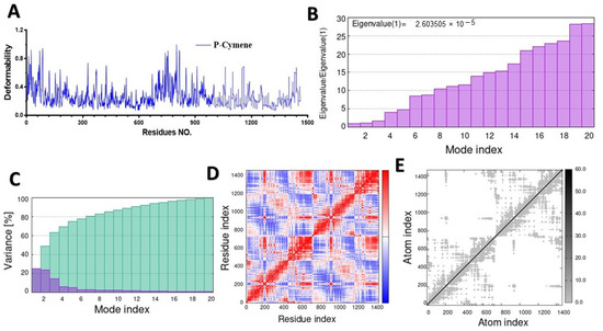 Molecular dynamic simulation of a predicted DPP IV (5y7h) with p-cymene: (A) deformability; (B) eigenvalues; (C) variance (blue: individual variances; green: cumulative variances); (D) covariance map (residues with correlated motions in red, uncorrelated motions in white, and anticorrelated motions in blue); (E) elastic network analysis.