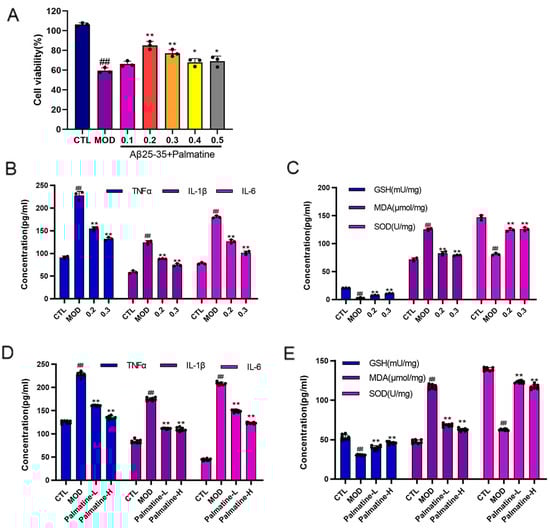 The anti-inflammatory and antioxidant power of palmatine. (A) Screening for protective concentrations of palmatine in rat pheochromocytoma cells (PC12) (n = 3). (B) Anti-inflammatory activity of palmatine in PC12 cells (n = 3). (C) Antioxidant activity of palmatine in PC12 cells (n = 3). (D) Anti-inflammatory activity of palmatine in mouse brain tissue (n = 8). (E) Antioxidant activity of palmatine in mouse brain tissue (n = 8). # p < 0.05; ## p < 0.01 vs. the control group; * p < 0.05; ** p < 0.01 vs. the model group. CTL: control group; MOD: model group; Palmatine-L: palmatine low-dose group; Palmatine-H: palmatine high-dose group.