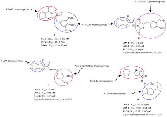 Structures and biological activities of dual COX-2/5-LOX inhibitors (I–IV) [16,17,18,19].