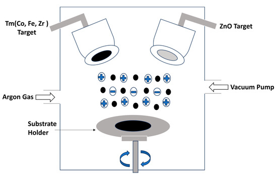 Thin films of ZnO doped with transition metals (TMs) such as Co, Fe, and Zr were deposited using dual magnetron sputtering equipment, as illustrated in Figure 1. The co-sputtering process of ZnO and TMs was successfully carried out utilizing a sputtering system that combines radio frequency (RF) and direct current (DC) sputtering. The ZnO and TM targets used in this process had a purity level of 99.9% and 99.95%, respectively. Both targets had a thickness and diameter of 3 mm and 2 inches, respectively. For consistent comparison and characterization, glass was employed as a substrate in the sputtering process. Before deposition, the substrate underwent a meticulous cleansing process involving the use of acetone and isopropyl alcohol (IPA). Subsequently, nitrogen gas flow was applied to the slide to eliminate any remaining impurities and adhesive particles. The substrate was then carefully positioned onto the substrate holder, maintaining 60 mm between the substrate and the target. The sputtering process of TMs was successfully executed using DC sputtering. A DC power of 25 W was supplied, resulting in a current of 70 mA and a voltage of 275 V throughout the deposition process. The base pressure was maintained at 6.6 × 10−3 Pa, and the rate of substrate movement was recorded at 100 rpm.