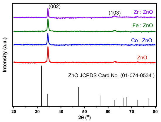 The XRD pattern of ZnO and TM-doped ZnO thin films that were deposited by co-sputtering can be seen in Figure 2. The findings of the XRD analysis show that the deposits are polycrystalline and have a crystal structure that is hexagonal along the c-axis. The spectra show a peak with a significant amount of intensity that corresponds to the (002) plane of 2 at 34.5 degrees, as well as peaks that correspond to the (103) plane of 2 at 62.8 degrees. The JCPDS Card number (01-074-0534) verifies the existence of this structure. Doping the material with a variety of transition metals resulted in a reduction in the intensity of the main peak (002). The intensity peak for Fe was less affected by the reduction when compared to the peaks for Co and Zr. The XRD peak strength decreases proportionately with the degree to which this lattice distortion causes the crystal lattice to become less organized [33]. When foreign ions are introduced into the ZnO lattice, it has the potential to cause defects and disorder, which in turn lowers the intensity of the XRD peaks [34].