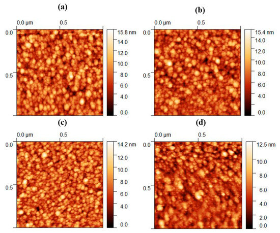 AFM micrographs of ZnO doped with TM. (a) Pure, (b) Co, (c) Fe, and (d) Zr.