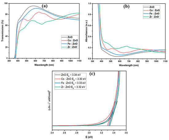 The deposited thin films’ optical properties were analyzed using a UV spectrophotometer with a wavelength range of 320 to 1200 nm. Figure 6a,b display the transmission and absorption spectra of the ZnO and TM-doped ZnO thin films. The transmittance measurements show relatively low values in the UV area but high values in the visible and near-infrared. We have also confirmed that the incorporation of transition metals into ZnO does not change the material’s intrinsic absorption edge. The absorption edge has been shown to move to longer wavelengths. At a wavelength of around 590 nm, the thin films of ZnO, Fe: ZnO, Co: ZnO, and Zr: ZnO showed maximum transmittances of roughly 98%, 90%, 84%, and 68%, respectively.