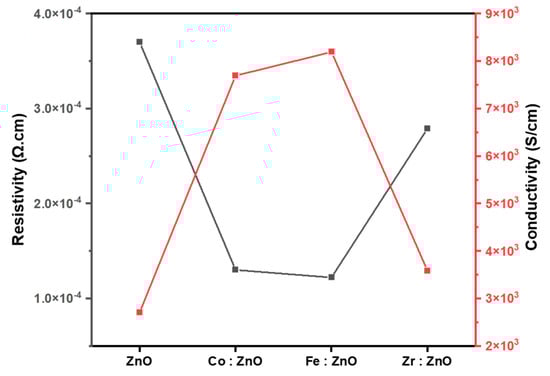 The conductivity and electric resistivity of thin films of ZnO and TM (Co, Fe, and Zr)-doped ZnO are shown in Figure 8. Doping Co into ZnO enhances the carrier concentration and improves the charge carrier transit, as seen in the figure, leading to higher conductivity and lower resistivity. In addition, Fe doping in ZnO increases the conductivity, whereas Zr doping increases the carrier concentration. Zr doping raises the fermi level, and moves the fermi level into the band, all of which reduce the diffusion length of the carriers and, in turn, decreases the conductivity. ZnO’s bandgap is widened due to the incorporation of impurity energy levels by the transition metal dopants. These energy levels may generate new charge carriers by absorbing or re-emitting electrons from the valence band [66,67].