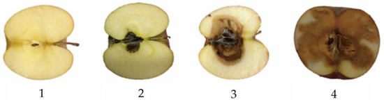 Apple mold heart disease, seriously affecting apple quality and yield, is a major disease that is caused by a variety of bacteria, such as Penicillin and Patulin. There are five to six types of fungi that have the highest frequency of occurrence among the apple core-dwelling bacteria, including Alternaria, Pink Monotelomeria, Fusarium, and Pseudomonas. The apple suffers from damage starting from the ventricles and gradually spreading outward to rot. The heart of the diseased apple turns brown and is filled with gray-green mold-like substances (mainly composed of Alternaria and Fusarium), sometimes pink mold-like substances (mainly composed of Pink Monocytospora), and these pathogens all have the ability to produce toxins. During storage, when the core of the apple is severely moldy and rotting, water-stained, brown, and irregularly shaped wet rot plaques can be seen on the apple carcass [4,5]. The plaques can be connected to each other and form patches [4,5]. Finally, the entire apple rots, and the flesh has a bitter taste. Especially when diseased fruits are mixed into the deep processing of apples, the moldy tissue that accumulates toxins can lead to excessive accumulation of mycotoxins in deep processed foods such as apple juice, jam, and canned food (the World Health Organization sets a maximum concentration of 50 μg/L), causing potential food safety hazards [6,7,8]. If people consume the fruits of this disease, the risk of cancer, teratogenicity, and fertility will greatly increase, posing a serious threat to human health [9,10]. The symptoms of diseased apples mainly include fruit ventricular mildew (mildew heart type), fruit ventricular browning (browning type), and fruit heart rot (heart rot type) [11,12]. The diseased apple entering the market will seriously endanger the health of consumers and affect the economic benefits of the apple enterprise. The mildest symptom of mold heart disease is that it only occurs within the fruit pit and does not infect the flesh, and the pit area generally accounts for 6% of the cross-sectional area of the apple. Therefore, a disease degree of less than 6% is considered the standard for mild mold heart disease. In some relevant literature, a degree of less than 10% is defined as mild mold heart disease [13], and a degree of 6% to 10% is defined as slightly severe mild mold heart disease. In addition, the incidence rate of 10% to 14% is general mold heart disease, and when the incidence rate is greater than 14% of the affected area, the apple has already undergone severe mold transformation, which is easy to distinguish from the surface of the apple. As the severity of the disease increases, the accuracy of identifying mold heart disease shows an upward trend. Samples of apples with different degrees of mold heart disease are shown in Figure 1. However, the surface of the diseased apple shows no obvious external symptoms in the early and middle stages of mold heart disease, which causes difficulties in picking a good apple. Therefore, a non-destructive detection method for apple mold heart disease is extremely important for the development of the world’s apple industry.