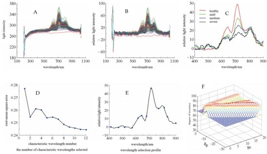 Data processing and analysis. (A) Original projected energy. (B) After deducting the dark light spectrum (C) After MSC preprocessing. (D) Number of selected characteristic wavelengths. (E) Wavelength selection distribution map. (F) Optimization of parameters c and g for SVM.