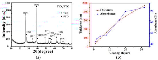 (a) XRD pattern of TiO2-20, (b) the variation curves of film thickness and absorbance as the layers of coatings increase.
