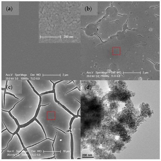 (a) SEM images of TiO2-1, (b) TiO2-4, (c) TiO2-20, and (d) TEM of TiO2-20. Inset is the close-ups of TiO2-1. Red boxes in Figure 2b,c designate two continuous small areas in surface of TiO2-4 and TiO2-20.