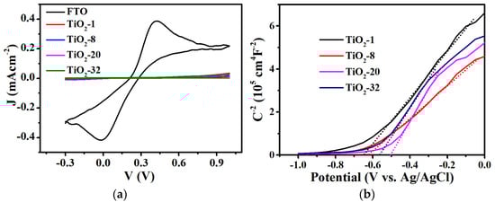 (a) CV of FTO, TiO2-1, -8, -20, and -32. The measurement was carried out by a three-electrode system with TiO2 film as working electrode, Pt plate as counter electrode, and Ag/AgCl electrode as reference electrode, respectively, and a scan rate of 20 mV s−1. The electrolyte solution was 0.5 × 10−3 M K4Fe(CN)6 + 0.5 × 10−3 M K3Fe(CN)6 in aqueous 0.5 M KCl. (b) Mott–Schottky plots of TiO2 films; measured at 10 kHz, sweep rate 100 mVs−1. The electrolyte solution was 0.5 × 10−3 M Na2SO4.