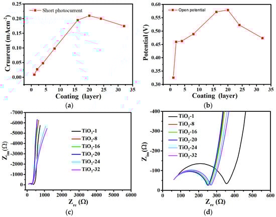 Patterns of variation in (a) short circuit current and (b) open circuit voltage as the layers of coatings of TiO2 films. (c) Complete range Nyquist plot and (d) zoom at high-frequency region. Measuring condition: a 20 mV of AC signal was applied for a frequency range from 100 mHz to 400 kHz under UV-LED irradiation at a direct current bias of 0 V. The electrolyte solution was 0.5 × 10−3 M Na2SO4.