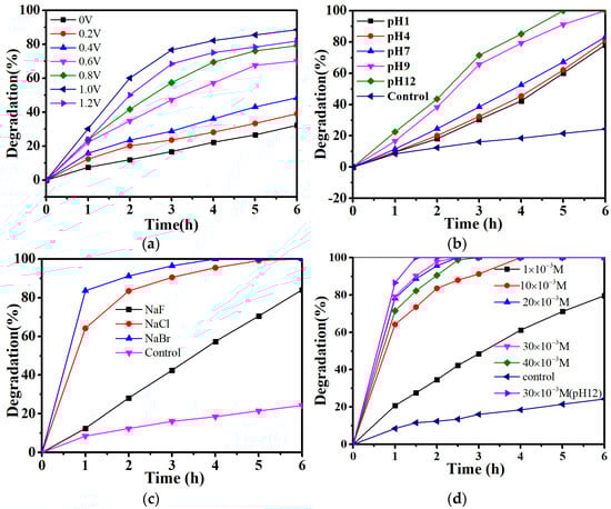 We carried out the PEC degradation of MO using the PEC reactor as shown in Scheme 1a. Figure 5a shows the variation in the degradation rate of pristine MO using the TiO2-20 photoelectrode, with the potential bias ranging from 0 V to 1.2 V. Generally, in the PEC process, the degradation rate increased with an increasing bias, up until the optimized value of 1.0 V. Song et al. [27] and Zanoni et al. [28] reported similar results, in which at the optimal potential bias (for a given light intensity and film thickness), the electrons and holes were so well separated that enhancing the potential bias led to no significant improvement in the PEC activity. The PEC degradation of MO was further carried out using different thicknesses of TiO2 photoelectrodes. As expected, TiO2-20 achieved the highest degradation rate of 88.6% in 6 h among the representative samples at a bias of 1.0 V (Figure S4). This result is in accordance with the data of photoelectrochemical characterizations. Therefore, PEC regulation of MO by TiO2-20 with a 1.0 V bias was chosen and used for the tests of different pH, halide ion, and concentrations of Cl, respectively.