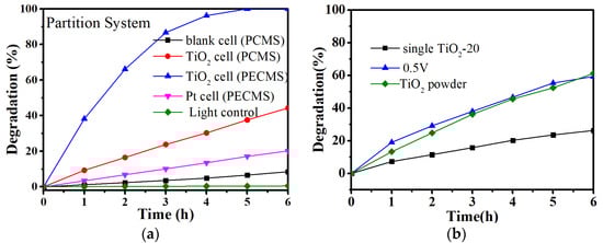 The contrast of the PEC and PC efficiency of TiO2-20 was carried out using PCMS and PECMS reactors, as shown in Scheme 1c,d. Figure 6a shows that the degradation rate of MO by TiO2-20 in the PCMS reactor is 41.5% in 6 h in the PC process, while that with a 1.0 bias in the PCEMS reactor is 100% in 5 h in the PEC process. Figure 6b shows that the TiO2-20 in the PC reactor earned 26.3% degradation of MO, while the same TiO2-20 with 0 V bias using the PEC reactor gained an enhanced degradation rate of 32.3%. It is expected that the application of a potential (0 V) over the flat-band potential (−0.51 V for TiO2-20) can suppress the charge carrier recombination and improve the PEC efficiency according to data of photoelectrochemical characterizations. These results indicate that the PEC process under electrochemical control achieves a much higher degradation rate than the PC one.