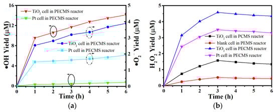 (a) •OH, •O2−, and (b) H2O2 yield in TiO2 and Pt cell of PECMS reactor under UV irradiation.