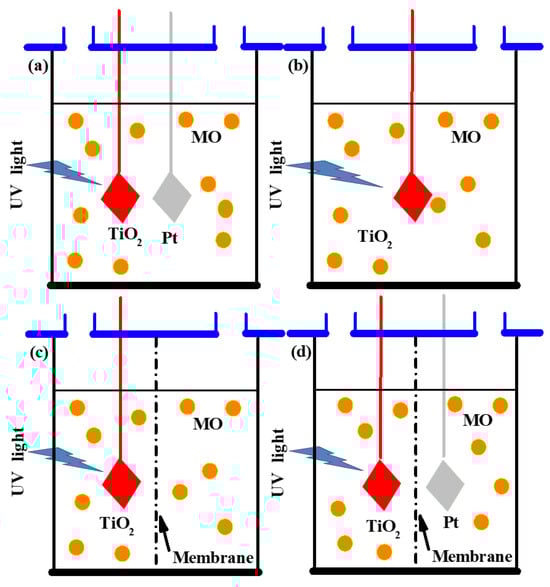 Schematic diagrams of experimental reactors with about 100 mL of volume glass container for PEC and PC regulation of MO. (a) PEC, (b) PC, (c) PEMS, and (d) PECMS reactors.