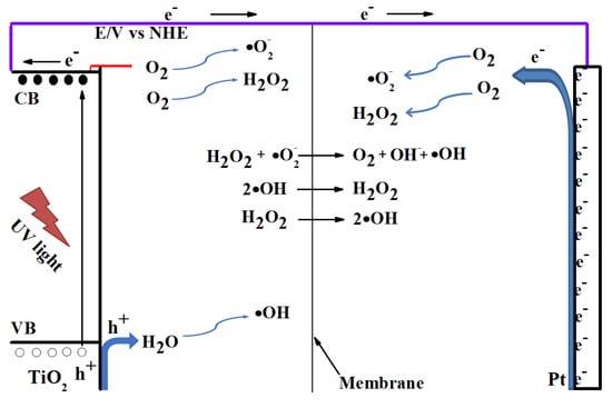 The •OH yield in the Pt cell of the PCEMS reactor should originate from the Pt electrode because •OH in TiO2 cell has a very short lifetime and cannot pass through the membrane to the Pt cell. It well known that electrons can react with O2 to produce •O2−, and then H2O2 and •OH through a reductive process (Formulas (2)–(6)) [44,45]. The very low •OH yield suggests that a low level of kinetics evolution of •OH proceeds in the Pt cell of a PCEMS reactor.