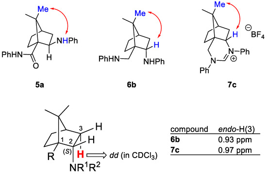 The configurations at the newly formed stereogenic centers (C-2) in endo-diamine 6b and endo-amidine 7c were determined using NOESY spectroscopy. The cross-peak between the exo-H(2) and the Me-C(8) group was consistent with the (2S)-configuration (Figure 2). Similarly, the (2R)-configuration at C-2 in exo-camphoramine 5a was in line with the NOE between the Me-C(8) and the exo-NH group (see Supplementary Materials). The endo-stereochemistry of diamine 6b and cyclic amidine 7c was additionally confirmed on the basis of a chemical shift and multiplicity of the endo-H-C(3), which appear as a doublet of doublet at 0.93 ppm (6b) and 0.97 ppm (7c) (Figure 2) ([21,23], see Supplementary Materials).