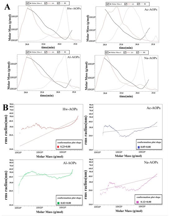 The weight-average molecular weight (Mw) distribution and polydispersity (Mw/Mn) of the four AOPs fractions were determined using SEC-MALLS-RI, following the methodology proposed by Wu et al. [56]. The AOPs powder (4.0 mg) was dissolved in 4 mL of 0.1 M NaNO3 aqueous solution containing 0.02% NaN3, filtered through 0.45 μm membranes. The sample solution (100 μL) was injected and measured on a DAWN HELEOS-II laser photometer (Wyatt Technology Co., Goleta, CA, USA) equipped with two tandem columns (300 × 8 mm, Shodex OH-pak SB-805 and 803; Showa Denko K.K., Tokyo, Japan) at a flow rate of 0.6 mL/min and a column temperature of 45 °C. The concentration of fractions and the dn/dc value were simultaneously determined using a differential refractive index detector (Optilab T-rEX, Wyatt Technology Co., USA). The mobile phase consisted of a 0.1 mol/L NaNO3 solution containing 0.02% NaN3.