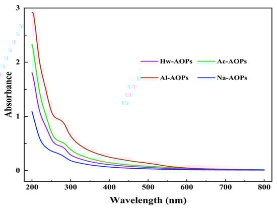 The UV spectra of AOPs are shown in Figure 2. The protein absorption peaks at 280 nm were detected for both Al-AOPs and Ac-AOPs, indicating the potential presence of protein and nucleic acid within these two polysaccharides. The spectral curves of Hw-AOPs and Na-AOPs exhibited a relatively smooth profile, suggesting that a minimal or insignificant protein and nucleic acid content existed. This outcome was in line with the findings from the chemical analysis.