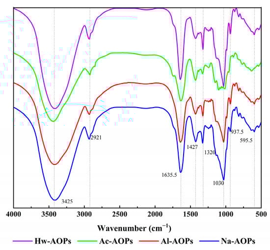 FT-IR spectroscopy was used to further investigate the structural characteristics of four AOPs. The structures of the four AOPs exhibited a high similarity, as illustrated in Figure 3. The characteristic peaks of polysaccharides were observed at frequencies around 3400, 2930, 1640, 1425, and 1030 cm−1 in the AOPs samples [35]. The strong and broad absorption band observed at approximately 3400 cm−1 was indicative of the presence of O-H stretching vibrations, which was attributed to both intramolecular and intermolecular interactions within the polysaccharide chains [36]. The weaker absorption peak at 2930 cm−1 was the stretching vibration of the sugar C-H [37]. The absorption peaks at 1640 cm−1 and 1420 cm−1 were assigned to asymmetric and symmetric C=O stretching vibrations, further indicating that these AOPs are acidic [38,39]. Meanwhile, there was no significant adsorption at 1730 cm−1, indicating the uronic acids in the four AOPs were non-esterified [40,41]. The absorption peaks within the 1200–950 cm−1 range can be classified as either C-O-H variable angle vibrational absorption peaks or C-O-C stretching vibrational absorption peaks in the pyranose ring [42].