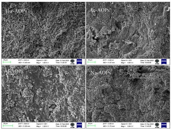 Scanning electron microscopy (SEM) is a valuable tool for polysaccharide structural analysis, as it enables the observation of surface morphological features and structural differences in samples [43]. Therefore, scanning electron microscopy (SEM) is widely utilized for the examination of the morphology and microstructural features of polysaccharides. As shown in Figure 4, the surface morphology of AOPs extracted by different solvents showed significant differences in shape and size. The surface of polysaccharides extracted by hot water (Hw-AOPs) was rough, with more granular spheroids. Na-AOPs extracted by saline solution were similar to the Hw-AOPs, with relatively few granular spheroids. The surface of Ac-AOPs, however, exhibited a relatively loose structure with small fissures, suggesting that the addition of hydrochloric acid may disrupt the polysaccharide architecture and reduce its overall size. The surface of Al-AOPs extracted by alkali solution exhibited irregularly granular or reef-shaped morphology, characterized by a rough texture. These findings suggested that the choice of extraction solutions can significantly impact the surface morphology of polysaccharides.
