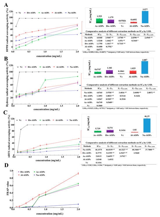 The assessment models of DPPH radical scavenging are extensively employed for evaluating the antioxidant activity of natural products [44]. As depicted in Figure 5A, four samples of AOPs exhibited the ability to scavenge DPPH radicals, and this scavenging activity exhibited a positive correlation with the concentration of AOPs. At the concentration of 2 mg/mL, the DPPH radical scavenging rates of Na-AOPs, Ac-AOPs, Hw-AOPs, and Al-AOPs were found to be 41.82%, 61.30%, 71.78%, and 75.67%, respectively. The 50% inhibitory concentration (IC50) values of Na-AOPs, Ac-AOPs, Hw-AOPs, and Al-AOPs were calculated to be 4.02, 1.52, 1.18, and 0.45 mg/mL, respectively. The Al-AOPs exhibited the highest DPPH radical scavenging capacity among the four polysaccharide samples, potentially attributed to the alkaline environment that facilitated the solubilization of polyphenols and proteins. The DPPH radical scavenging activity of the Hw-AOPs was superior to the Ac-AOPs, consistent with previous findings reported by Chen et al. [31].