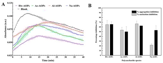 The effects of the four AOPs on the nucleation and aggregation of CaOx crystals are illustrated in Figure 7. The addition of the four AOPs resulted in a prolonged nucleation tmax of the crystals, as depicted in Figure 7 and Table 4. Additionally, there was a reduction observed in both the SN and SA of CaOx crystal. The nucleation inhibition rates of Hw-AOPs, Ac-AOPs, Al-AOPs, and Na-AOPs at a concentration of 0.5 mg/mL on CaOx crystallization were determined to be 65.00%, 53.33%, 66.67%, and 21.67%, respectively, while the aggregation rates of CaOx crystals were observed to be 65.60%, 49.97%, 62.48%, and 53.10%. The inhibitory effect of AOPs on CaOx crystal nucleation followed the following order: Al-AOPs > Hw-AOPs > Ac-AOPs > Na-AOPs. In terms of aggregation, Hw-AOPs showed the strongest ability to promote aggregation, followed by Al-AOPs, Na-AOPs, and Ac-AOPs.