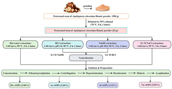 The extraction solvents included deionized water, an aqueous solution of HCl (pH 3.0), an aqueous solution of NaOH (pH 10.0), and a 0.1 M aqueous solution of NaCl. The pretreated powder (25 g) was extracted 2 times for 2 h with the residue to solvent ratio of 1:60 (w/v), the temperature of extraction was controlled at 90 °C by a thermostat water bath. After extraction, the supernatant of HCl and NaOH solutions was neutralized with 0.1 M NaOH and 0.1 M HCl, and then centrifugation (5000 r/min, 5 min), respectively. The extraction solution underwent pressure reduction and was subsequently concentrated to 1/4 of its initial volume. Subsequently, anhydrous ethanol was added in a quantity four times that of the concentrated solution, followed by thorough mixing and overnight incubation at 4 °C. Then, the solution was centrifuged at 5000 r/min for 15 min, the supernatant was removed, the precipitation was collected, and the precipitation was cleaned with anhydrous ethanol and acetone three times in a turn. The precipitate was redissolved in deionized water, followed by deproteinization using trichloroacetic acid (TCA), decolorization employing D101 macroporous resin, and dialysis with tap water and distilled water for 48 h (molecular cut-off of 2000 Da). Subsequently, the solution was freeze dried and named Hw-AOPs, Ac-AOPs, Al-AOPs, and Na-AOPs samples. The procedures for detailed extraction and isolation of AOP are summarized in Figure 8.