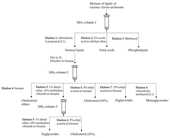 In general, single or dual organic solvent extraction, liquid–liquid extraction (LLE) and SPE are mainly used to extract, and then fractionate lipids. The main advantage of the utilization of SPE with a properly selected sorbent enables isolating particular lipid classes. A basic scheme for the fractionation of lipid classes proposed by Kaluzny et al. [24], which utilizes an NH2 column for the fractionation of a lipid mixture into fractions of different polarity, can be seen in Figure 1. SPE is commonly used for analytes enrichment, especially when they are present in a sample at a low concentration, such as eicosanoids, steroid hormones and fatty acid esters of hydroxy fatty acids. Accurate and proper fractionation of lipid classes in muscle foods analysis is required to achieve an authentic fatty acid profile appropriate for a given fraction. A traditional approach for muscle lipid separation utilized the SPE method; however, the main problem was with the neutral lipid fraction, which contains a certain amount of phospholipids. The further development of that method, changing the type, proportion, and volume of used solvents as well as the aminopropyl minicolumn size, contributed to reducing phospholipids in the first fraction to almost undetectable.