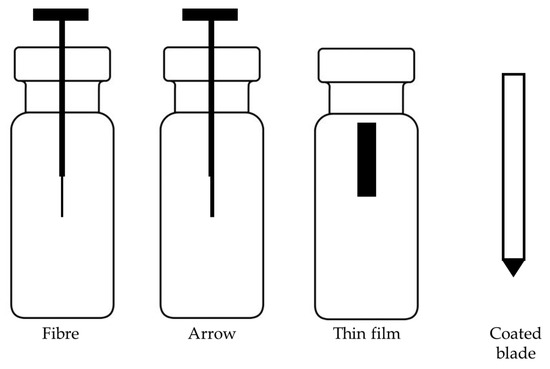 The traditional SPME consists of coated fused silica fiber. This device, developed in the early 1990s, has certain limitations described in the previous section. To overcome these limitations, improvements and new geometries of SPME were proposed in recent years, as presented in Figure 2. The main direction of new developments was increasing the surface area of the coating to increase the extraction rate. An example of a device with an increased surface area is SPME arrows, which are based on a stainless-steel rod fiber with an arrow tip [133]. Compared to fibers, arrows improve the robustness, help to avoid background contamination and have higher sensitivity due to the possibility of longer and thicker sorbent phases [134]. This leads to the limitation of this device, which is the longer extraction time needed to reach equilibrium. Another drawback of arrows is the need to modify the GC inlet with specially designed liners with higher diameters compared to SPME fibers. SPME arrows have been successfully applied for the analysis of compounds in food matrices, including fermented fish sauce [135], Korean distilled spirit [136] and Korean edible plants [137]. Thin-film solid-phase microextraction (TF-SPME) has been validated as a novel sampling device and it demonstrated potential as an extraction method used in food analysis. TF-SPME is characterized by a larger extraction phase volume and surface area-to-volume ratio compared to traditional SPME fibers [138]. Therefore, TF-SPME enables enhanced capacity and a higher extraction rate than the traditional form. This format of SPME was applied in combination with LC, GC, and direct MS. Coated blade spray (CBS), which is a sorbent spread on the metal plates coupled directly to the MS device, was successfully used for the analysis of 1–5 veterinary drugs in meat [139]. A sorbent spread on aluminum foil was used for the determination of five individual polychlorinated n-alkanes from cod liver oil samples [140]. Recently, sorbent spread on carbon mesh was also used as an extraction tool for odorants from beer [2]. TF-SPME demonstrated a high potential for food analysis since it enables analysis of a wide range of compounds, and more varieties of sorbent phases have been utilized in this form of SPME [2]. The only drawback of this device compared with SPME fibers is the lack of full automation. Although the desorption of TF-SPME might be fully automated, for both LC and GC, their geometry still poses a barrier for online extraction.