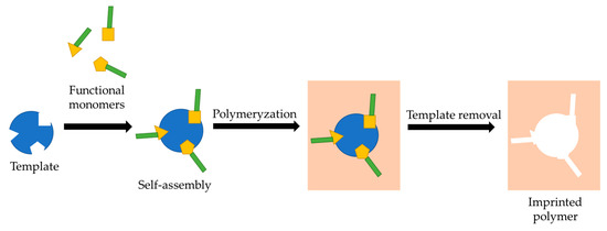 For sorbent-based methods, the lack of selectivity of sorbents is the main drawback. In research on selective sorbents, different materials have been tested, such as restricted-access materials (RAMs), immunosorbents or oligosorbents. RAMs, which interact via hydrophobic interactions and a size exclusion effect, found the majority of applications in toxicological and clinical analyses, immunosorbents and oligosorbents synthesized using antibodies and aptamers, respectively, bound to solid support also found numerous applications in food analysis (i.e., immunoaffinity columns for mycotoxins analysis) [21]. The main area in selective sorbent phases, developed since the 1990s, is the construction of MIPs—synthetic materials able to bind target molecules mimicking natural receptors. Manufacturing involves three steps: (i) formation of the pre-polymerization complex between the template and the monomer; (ii) polymerization in the presence of a cross-linker; (iii) removal of the template to give the imprinted polymer (Figure 4) [21]. The analytical potential of MIPs is also related to their commercial availability, where MIPs tailored for analysis of, i.e., specific mycotoxins or bisphenols, are available. In the majority of applications, MIPs are designed for SPE; consequently, molecularly imprinted solid-phase extraction (MISPE) can be realized in two modes: offline and online. The offline process requires the same approach to SPE and the eluate can be analyzed by GC or HPLC, which is automated in the direct coupling of MIPs in the analytical system [155]. MIPs found applications mostly in the analysis of harmful substances in food, such as pesticide residues, veterinary drugs, dyes or toxins. The detailed discussion of the application of MIPs in the detection of the main regulated groups of contaminants has been discussed by Regal et al. [155]. MIPs are used for the analysis of residues in food which are classified by EU Council Directive 96/23/EC: drugs as growth promoters (anabolics, antithyroid agents, beta-agonists), authorized veterinary drugs and contaminants. MIPs have been used for the analysis of stilbenes in fish and milk, β-agonists in pork chloramphenicol in milk and honey [156,157]. The majority of them were analyzed in MISPE with HPLC to separate the compounds. Similarly, tetracyclines were analyzed in fish, eggs, and chicken muscle using MISPE, but also MIPs on SPME fiber [158]. MIP-SPME mentioned here used for the analysis of tetracycline and related compounds oxytetracycline, doxycycline and chlortetracycline offered LODs in the range of 1–2.3 µg/L when analyzed by HPLC with a fluorometric detector. Quinolones and fluoroquilnolones were determined by MISPE and HPLC in fish, chicken muscle and baby foods. The use of MIPs for d-SPE was also explored for applications in food analysis and used for the detection of dioctyl phthalate in fish [159] and acrylamide in bread [160].