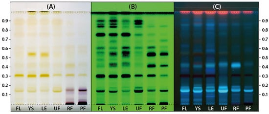The HPTLC chromatograms of extracts prepared from Ligustrum vulgare flowers (FL), young shoots (YS), leaves (LE), and unripe (UF), ripe (RF) and postseason (PF) fruits photographed under white light, (A) at 254 nm (B) and 366 nm (C).