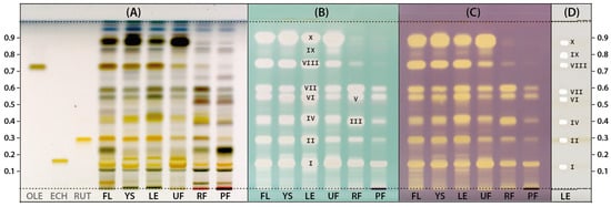 To obtain more detailed profiles, the HPTLC plate was sprayed with vanillin reagent. According to Do et al. (2021) [35], the vanillin reagent may be a suitable alternative to the anisaldehyde reagent, which is widely used to detect various natural products whose native forms are not colored. Chromatograms obtained for the LV extracts and three additional solutions of the standards: oleuropein (OLE), echinacoside (ECH), and rutin (RUT) derivatized with the vanillin reagent were photographed in white light and are presented in Figure 2A. The mentioned reference compounds were selected due to their documented presence in Ligustrum species and their confirmed antioxidant properties. Their presence was also confirmed in the tested LV extracts based on the consistency of color and Rf parameters of the appropriate bands. In the case of OLE and RUT, the most intense bands indicating their high concentration were observed for extracts from flowers, leaves, and young shoots of LV. In turn, the extract from unripe fruit contained the highest ECH amount.