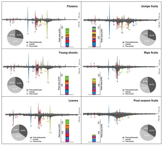 Identification of individual compounds makes it possible to determine the percentage contribution of each chemical group to the antioxidant capacity of the sample based on the areas of negative peaks. The contribution of phenylethanoids, iridoids, and flavonoids to the total antioxidant activity of the tested LV extracts is presented in the form of pie charts in Figure 3. Compared to the other groups, iridoids were mainly responsible for the antioxidant activity in all studied extracts except for the ripe fruits, in which phenylethanoids dominated with verbascoside at the forefront. Flavonoids were responsible only for approximately 25% of the total antioxidant activity exhibited by studied L. vulgare extracts.