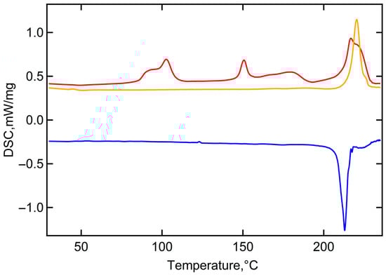 DSC thermograms of I(CH2)2(CF2)2O(CF2)2SO2OH: 1st heating (red), cooling (blue), and 2nd heating (orange). Exothermal processes are presented downwards.
