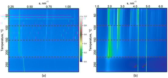 Temperature-resolved SAXS (a) and WAXS (b) curves corresponding to a heating ramp. Color table indicates the peak intensity of 1D diffractograms as a function of the norm of the scattering vector s. Two intense reflections marked by arrows are attributed to aluminum foil. Red dotted lines indicate phase transitions.