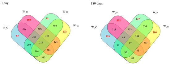 Sequence similarity of the peptides obtained in canned pork meat (numbers indicate the number of identical sequences determined between the designated samples) (W_C—control; W_05—black currant leaves extract 50 mg/kg; W_10—black currant leaves extract 100 mg/kg; W_15—black currant leaves extract 150 mg/kg).