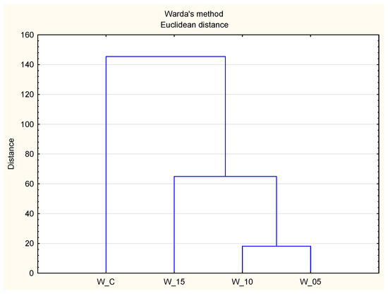 Graphical presentation (HCA dendrogram) of the relationship between samples based on their antioxidant properties (W_C—control; W_05—black currant leaves extract 50 mg/kg; W_10—black currant leaves extract 100 mg/kg; W_15—black currant leaves extract 150 mg/kg).