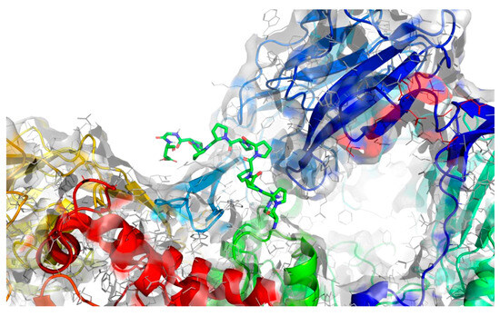 The best binding sites that were identified on the studied protein surfaces do not fully coincide with the literature data [38,39,40]. However, in the studies described in the cited sources, proteins such as 5NN8, 1O86, and 2QT9 interacted with a completely different ligand in comparison to the studied peptides. Depending on the type of chemical compound, different binding pockets on the protein structure may be preferred. Furthermore, it should be noted that each computational program dedicated to molecular docking is based on different mathematical algorithms and scoring functions, which may lead to certain discrepancies in the resulting data. Figure 5, Figure 6 and Figure 7 depict the spatial conformations of peptides that interact most strongly with the best binding pocket of the studied proteins.
