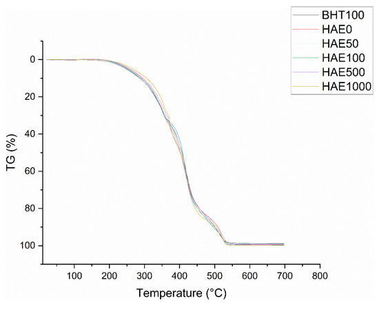 Thermogravimetric analysis (TGA) is a helpful method for investigating the alteration in the weight of samples as temperature rises. The decomposition temperature (Td) is the temperature at which the highest rate of weight loss occurs throughout each stage. The apex of the Td can be readily detected by analyzing the first derivative of the TGA curve about temperature, known as derivative thermogravimetry (DTG). According to Figure 1, the weight of fish oils with varying amounts of HAE dropped as the temperature rose from 25 to 700 °C. In addition to this, the recorded onset temperatures for Td, determined from the thermograms of the experimental groups, were as follows: BHT100 274.61 °C, HAE0 262.21 °C, HAE50 263.95 °C, HAE100 282.36 °C, HAE500 284.30 °C, and HAE1000 299.91 °C.