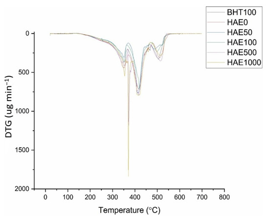 DTG curves of HAE and 100 ppm BHT in the atmosphere environment.