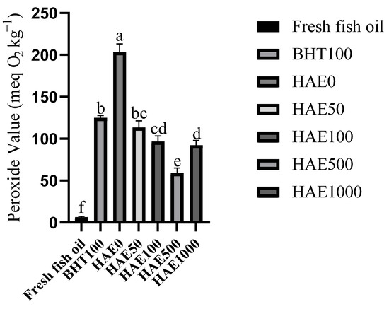 Effect on including HAE in various ratios and 100 ppm BHT to fish oils heated to 55 °C while continuously aerated on the development of peroxide after 96 h (n = 3). Significant differences between groups are indicated by values with different letters (p < 0.05).