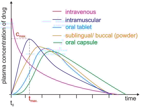 Plasma level time curves for different types of drug administration. The drug is delivered directly into the systemic circulation via intravenous injection, ensuring 100% bioavailability and immediate achievement of maximum plasma concentration (cmax, tmax = 0 min). For other parenteral routes, such as subcutaneous and intramuscular injections, most drugs show between 60 and 100% bioavailability due to little or no metabolism in the skin or muscle. However, the time to reach maximum plasma concentration (tmax) is significantly longer than that achieved by intravenous administration. Orally administered drugs achieve a bioavailability level substantially lower than 100% due to incomplete absorption and/or elimination during the first pass through the liver. Additionally, due to the indirect path to the plasma, they are characterized by a long time lag. Different dosage forms may result in differences in cmax and tmax.